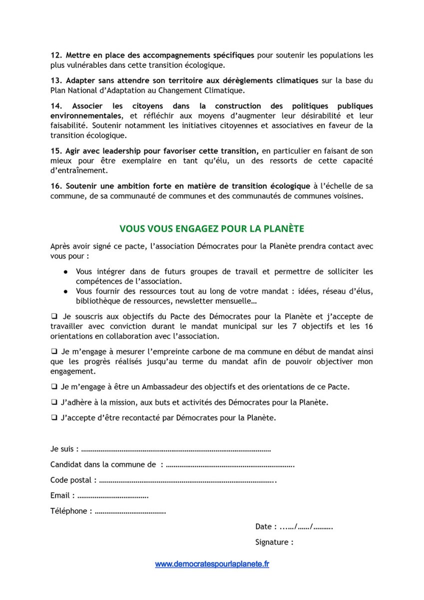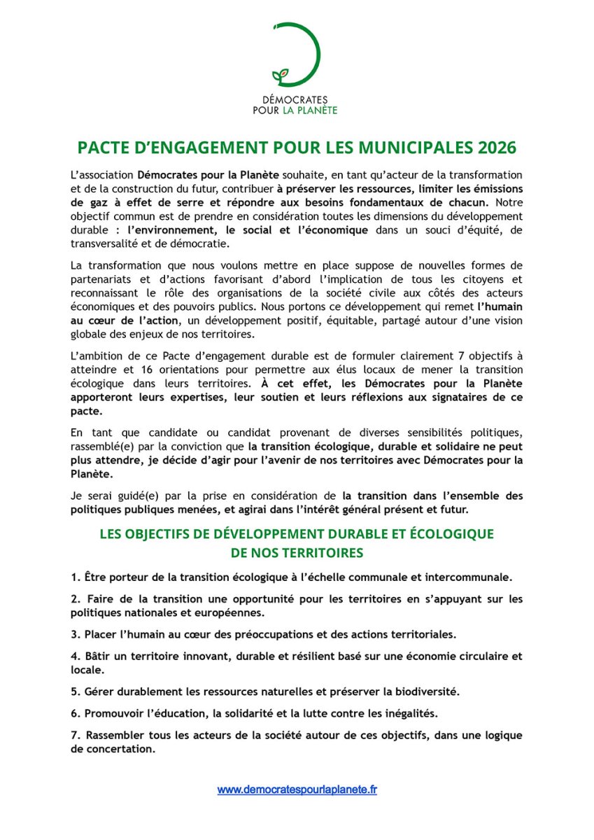 À l’approche des élections municipales de 2026, l’association Démocrates pour la Planète lance un Pacte d’engagement à destination de toutes les candidates et tous les candidats centristes, démocrates, progressistes et modérés qui souhaitent placer la transition écologique au cœur de leur projet municipal.